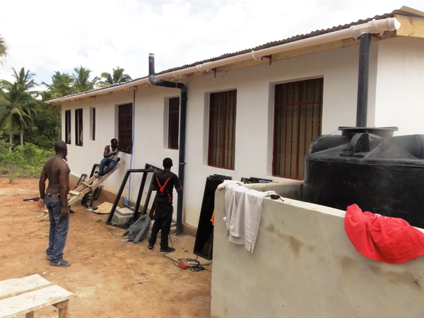 In der Zeit vom 16.8. bis 8.9.2012 steht eine Visitation der Anlage in Kiparang'anda an. Zwei Mtglieder des Vereins und ein Freiwilliger aus der Nähe von Karlsruhe machen sich auf den Weg, um sich einen Eindruck vom Stand der Dinge zu machen und um zahlreiche Arbeiten zu erledigen. Bei Ankunft sind die Arbeiten zur Fertigstellung des Nebengebäudes im vollen Gange. Das Dach ist fertig und das Gebäude ist innen und außen verputzt. Wir beginnen sofort mit dem Fliesen der Nasszellen und einer kleinen Küche. Gleichzeitig werden die Rohre für Wasser und Abwasser gelegt und auf dem Dach wird eine kleine Solaranlage mit ca. 2,2 KW Leistung montiert. Dies ist ein großer Fortschritt, da es hier noch keinen Strom gibt. An den Fenstern werdern Außengitter angebracht, die Türen können gesetzt werden und das Gebäude bekommt einen Außenanstrich. Dies ist dank einer großzügigen Einzelspende möglich geworden. Für die Wasserversorgung der gesamten Anlage wurde bereits ein stabiler Wasserturm gebaut auf den nun ein 5000 l Tank installiert wird. Am Schulgebäude werden die Toiletten fertig gestellt. Da die Geländer auf der Terasse zu schwach waren, müssen Verstärkungen her. Über das ganze Grundstück liegt weit verteilt der Müll herum und so wird mit den Kindern eine Sammelaktion gestartet und alles in einem großen Feuer verbrannt. Mit großer Begeisterung gehen die Kinder zur Sache und werden mit kleinen Geschenken in Form von Luftballons und gespendeten Plüschtieren entlohnt. Zuletzt werden noch drei Betten gekauft, so dass in naher Zukunft Gäste beherbergt werden können, die uns bei unserem Unterfangen unterstützen wollen. Sei dies bei anfallenden Reparaturen, Verschönerungsarbeiten oder der Bepflanzung des Grundstückes mit weiteren Nutzbäumen und Gemüsefeldern. Schon nach wenigen Monaten tragen Papaya und Bananen Früchte, aber es gilt noch vieles mehr zu pflanzen, da sich der Kindergarten in 2-3 Jahren selbst mit Lebensmitteln versorgen soll.