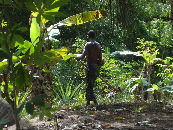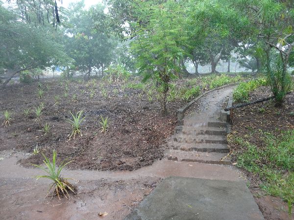 Vom 21.März bis 12.April sind zwei Vereinsmitglieder vor Ort. Es werden die restlichen neuen Kinder fotografiert und wie immer der Vorrat an Brennholz, Zucker, Mehl und Reinigungsmittel aufgestockt. In die beiden Klassenzimmer wird Strom verlegt und fortan haben sie Licht. Durch ein Abflussrohr sind Wurzeln eingedrungen und haben das ganze Rohr verstopft, so dass es einen Rückstau in einer Toilette gegeben hat. Eine Halterung der Dachrinnen wird erneuert und ein tropfender Wasserhahn ausgetauscht. Einige der Nägelköpfe bei den Wellblechen sind weggerostet und durch die Löcher dringt Wasser ein. Sie werden erneuert und für das nächste Mal wird angedacht, alle auszutauschen. Die Fenster, Geländer und Spielgeräte werden neu gestrichen. Die Regenzeit setzt ein und gewaltige Wassermassen weichen den Boden auf. Ein günstiger Zeitpunkt für die Aussaat. So werden hunderte Stecklinge der nahrhaften Kasawawurzel, 120 Ananas und circa 30 Papaya gesetzt. Um der Erosion vorzubeugen wird an vielen Stellen Gras angepflanzt, das das schnell fließende Wasser verlangsamen soll, um das ungehemmte Fortschwemmen der Erde zu verhindern.