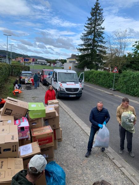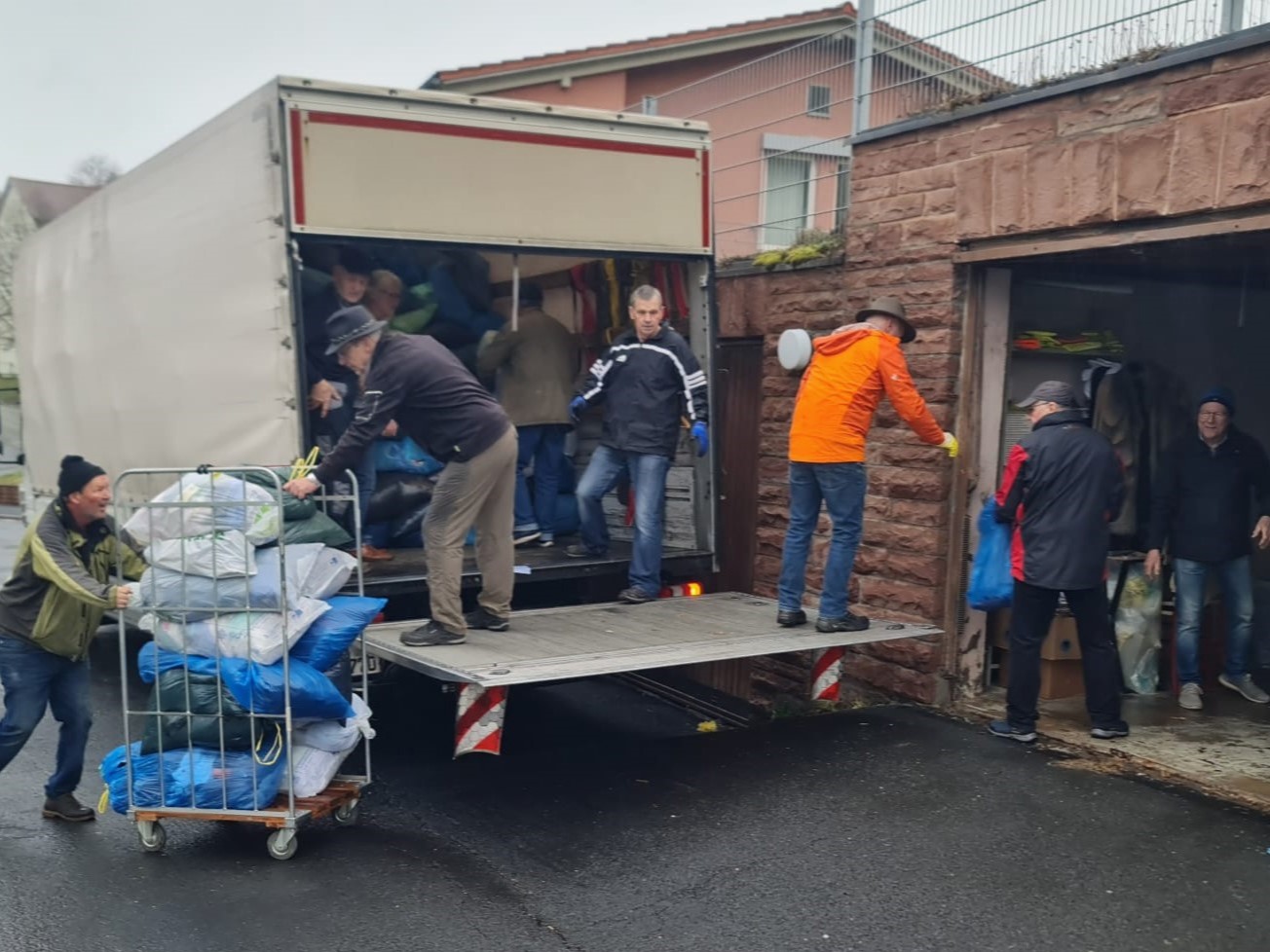 Verladung von ca. 5 to Altkleider in Rekordzeit bei den Garagen am Helios-Krankenhaus in Hammelburg. 13 Helfer haben das möglich gemacht.