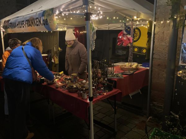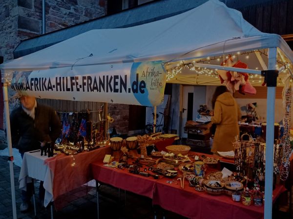 Teilnahme am Adventsmarkt in Hammelburg. An einem Informations- und Verkaufsstand werden afrikanisches Kunsthandwerk und Misteln angeboten. Die engagierten Helfer trotzen dem widrigem Wetter und lassen sich die Laune nicht verderben.