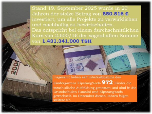 In der Grundschule Tumaini werden 10 Toiletten gebaut und in der Grundschule Kiparang'anda A 3 Klassenzimmer gefliest. In den Kindergärten Kikoo und Bigwa werden die Spielgeräte instandgesetzt und am Kindergarten Kiparang'anda wird das Dach der Klassenzimmer erneuert und zwischen den Lehrertoiletten und einem Lagerschuppen eine Wand errichtet. Wie immer werden die Vorräte an Zucker, Mehl und Reinigungsmittel ergänzt, so dass sie für 3 Monate reichen sollten. Zudem werden die Brennholzvorräte aufgestockt und 10 Reihen aufgehäufelt, in die in der Regenzeit Kasawa gepflanzt werden soll. Die 54 neuen Kinder für das Schuljahr 2025 werden erfasst und fotografiert. Im Moment werden noch 2 Paten gesucht.