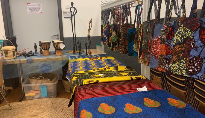 Teilnahme am Michaelismarkt in Hammelburg. An einem Informations- und Verkaufsstand werden afrikanisches Kunsthandwerk angeboten und Lose verkauft.